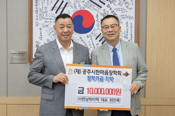 (재)공주시한마음장학회에 따르면, ㈜한남하이텍(대표 최만묵)은 지난 15일 지역인재 육성과 생활 형편이 어려운 학생들을 위해 써달라며 장학금 1000만원을 최원철 시장에게 전달했다.