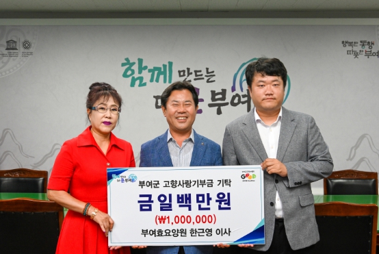 [뉴스서울] 부여군은 지난 14일 부여효(孝)요양원(대표 이순자) 한근영 이사가 고향사랑기부금 100만 원을 기탁했다고 밝혔다.