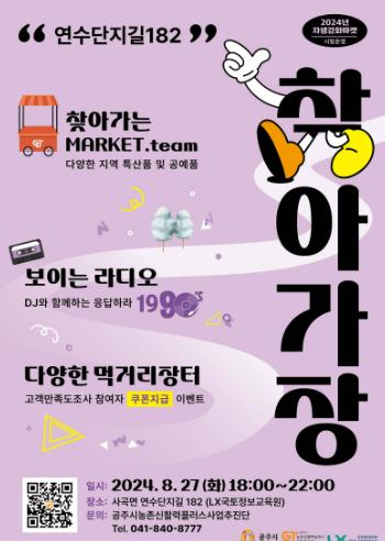 [뉴스서울] 공주시는 오는 27일 LX국토정보교육원에서 ‘자생강화마켓 연수단지길182(LX) 찾아가장(場)’ 행사를 개최한다고 밝혔다.