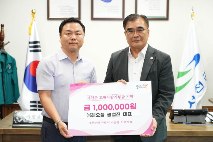 [뉴스서울] 논산시에 소재한 ㈜레오플 권철진 대표가 지난 21일 서천군을 찾아 고향사랑기부금 100만원을 기탁했다.
