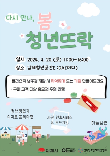 [뉴스서울] 김제시가 오는 20일, 청년창업가와 청년근로자들의 교육공간으로 이미지가 고착된 김제청년공간 E :DA(이다)를 친근하게 방문할 수 있도록 오픈 소통공간 플랫폼으로 활용하고자 ‘다시 만나, 봄 청년뜨락’행사를 개최한다.