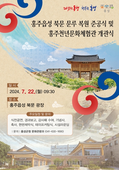 [뉴스서울] 홍성군은 문화유산 보존의 중요성을 조명하고 역사문화도시로서의 위상 재정립을 위한 ‘홍주읍성 북문 문루 복원 준공식 및 홍주천년문화체험관 개관식’ 행사를 오는 22일 홍성읍 오관리 24-7번지 일원 홍주읍성 북문 문루 광장에서 개최한다.