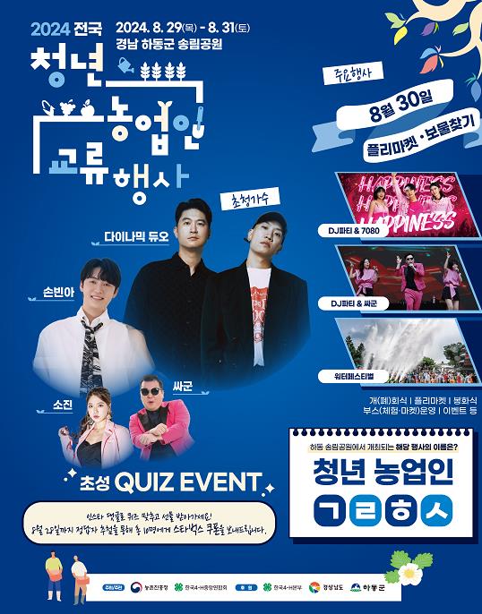 [뉴스서울] ‘2024 전국 청년농업인 교류행사’가 오는 8월 29일에서 31일 하동읍 송림공원에서 열린다.