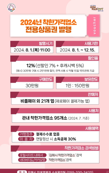 착한가격업소 전용상품권은 7월 기준 관내 95개 착한가격업소에서 사용할 수 있으며 사용처는 네이버지도, 카카오맵에서 ‘착한가격업소’를 검색하거나 시 누리집 착한가격업소 목록 등에서 확인할 수 있다.