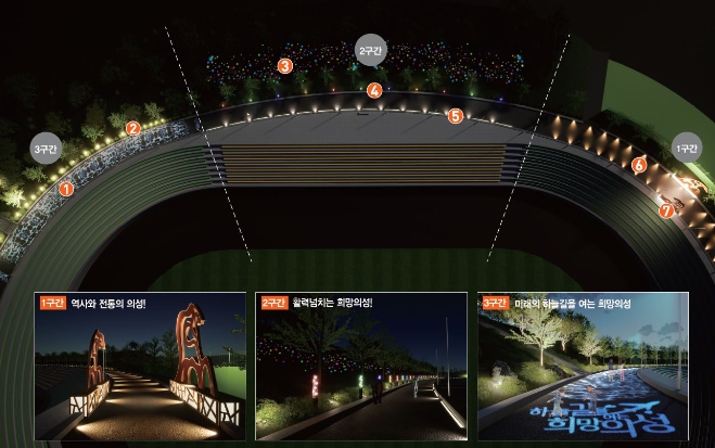 또한 종합운동장 뒤편 둔덕산 테마숲길과 연계한 음악방송 시스템을 통해 산책로를 따라 이동하는 동안 방문객들에게 빛과 음악이 함께하는 독특하고 매력적인 경험도 마련했다.