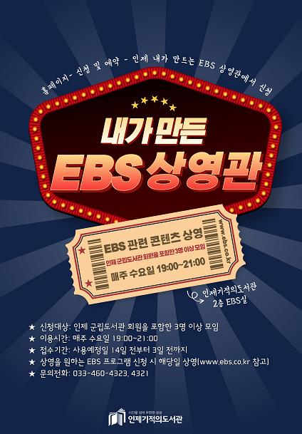 인제 기적의도서관 EBS 상영관에서는 매주 수요일 저녁 7시에서 9시까지 약18만 개의 EBS 영상 콘텐츠를 시청할 수 있다.