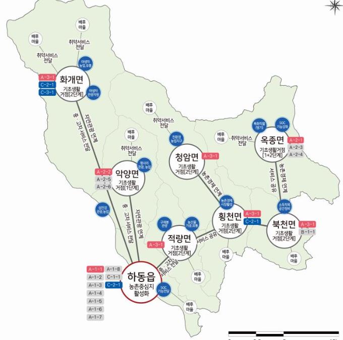 공모 시 제출된 사업계획은 △하동건강복합센터 건립 등 농촌중심지활성화사업(하동읍 190억 원) △행정복합센터 조성 등 기초생활거점조성사업(옥종·악양면 100억 원) △거점 및 배후마을 연계 서비스 전달(화개·적량·횡천·북천·청암 50억 원) △농촌인력중개센터 및 종자산업기반구축사업(23억 원) 등이 포함되어 있다.