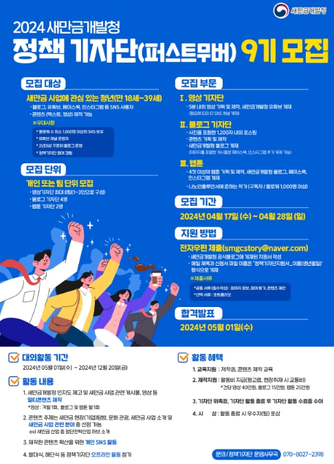 새만금 정책기자단은 새만금에 관심이 있고, 유튜브, 블로그 등 누리소통망(SNS)을 활발히 사용하며, 멀티미디어 콘텐츠를 제작할 수 있는 청년(만 18세~39세) 이면 누구나 지원 가능하며, 특히 올해는 웹툰 부분까지 확대하여 국민과의 소통을 더욱 강화할 예정이다.