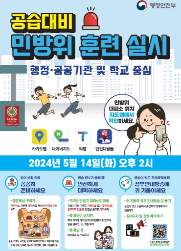 [뉴스서울] 행정안전부는 공습 대비 역량을 강화하기 위해 오는 5월 14일(화) 오후 2시부터 행정기관, 공공기관 및 학교를 중심으로 민방위 대피 훈련을 실시한다고 밝혔다.