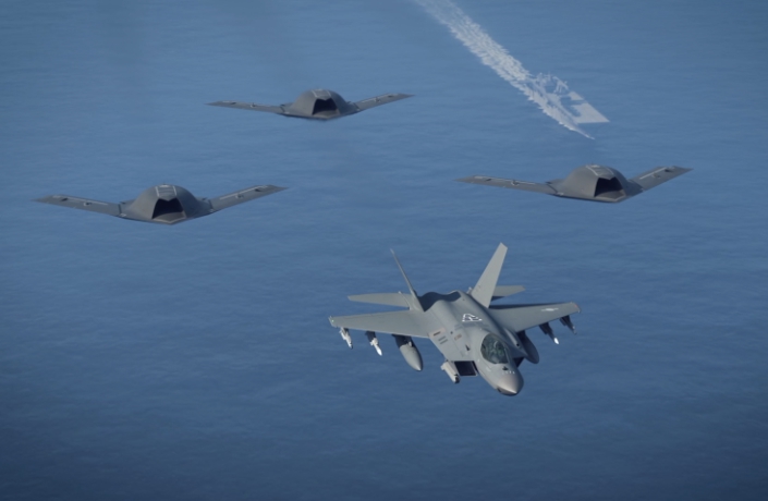 ▲ KF-21과 편대 비행을 하며 윙맨 역할을 하는 AI 무인 전투시스템(가상) |