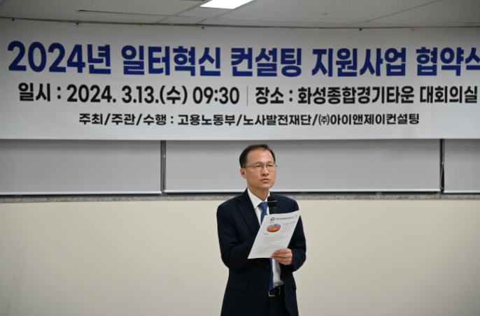 | ▲ 2024년 일터혁신 컨설팅 지원사업 협약식에 앞서 인사말씀을 하고 있는 김근영 화성도시공사 사장.(화성도시공사 제공) |