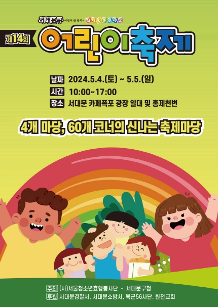 [뉴스서울] 서대문구가 제102회 어린이날을 맞아 5월 4일과 5일 오전 10시부터 오후 5시까지 구청 인근 카페폭포 광장과 홍제천 변 일대에서 ‘제14회 서대문구 어린이축제’를 개최한다.
