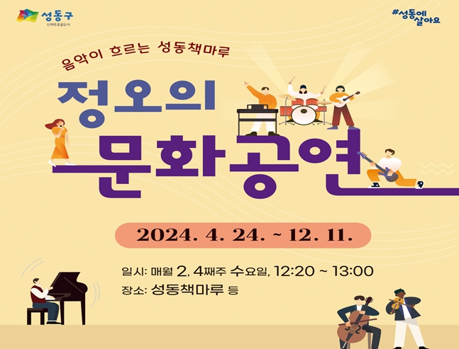 올해 ‘정오의 문화공연’은 성동책마루 등에서 오는 12월 11일까지 펼쳐지며, 시기와 계절에 어울리는 문화공연으로 지역 주민들에게 찾아갈 예정이다.
