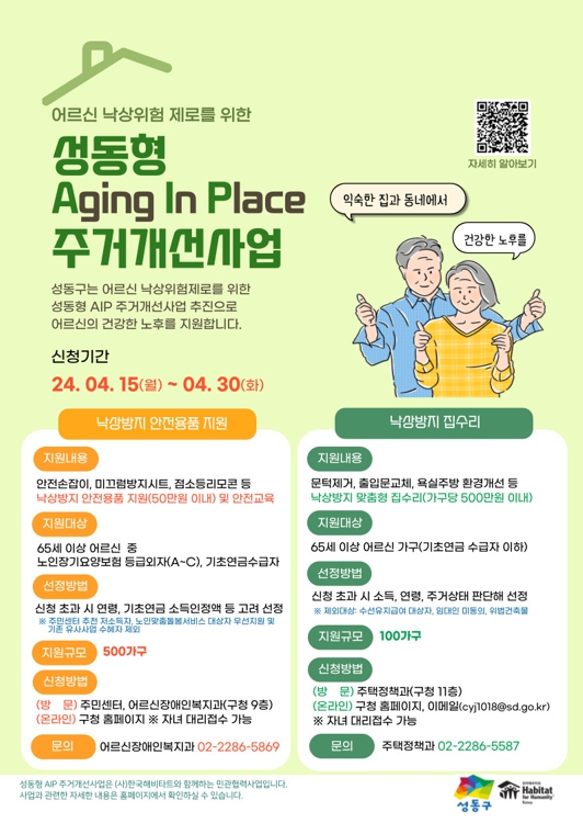 ‘성동형 AIP 주거개선사업’은 한국해비타트와 협력해 ▲ 낙상방지 안전용품 제공, ▲ 낙상방지 집수리를 연계해 추진하며, 65세 이상 어르신의 소득, 연령, 돌봄 필요 정도를 고려해 지원 대상을 선정한다.