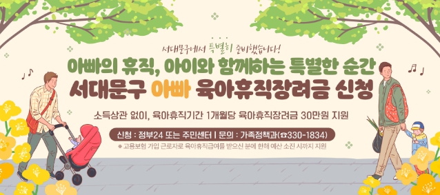 이성헌 구청장은 “남성의 육아 참여를 높이고 일과 가정의 균형을 이루어 가는 데 서대문구 아빠 육아휴직장려금 지원 제도가 도움이 되길 바란다”고 말했다.