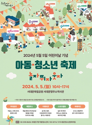 [뉴스서울] 서대문구가 다음 달 5일 오전 10시부터 오후 5시까지 서대문독립공원과 서대문형무소역사관에서 ‘2024년 어린이날 기념 아동·청소년 축제 놀자·뛰자·웃자’를 개최한다.