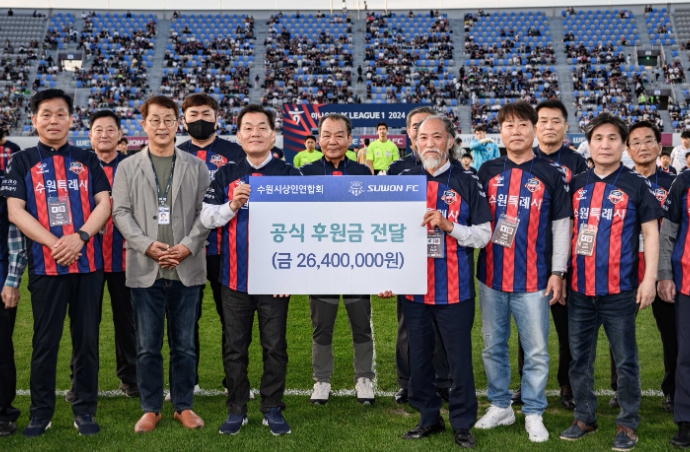 [뉴스서울] 수원시상인연합회가 19일 수원종합운동장에서 열린 수원FC와 포항스틸러스의 경기에 앞서 수원FC 구단주인 이재준 수원시장에게 후원금 2640만 원을 전달했다.
