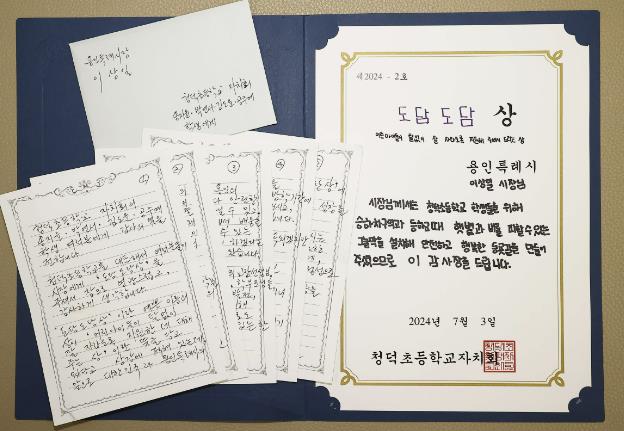 이 시장은 “대한민국과 용인특례시의 발전에 크게 기여할 청덕초의 학생들을 위해 시장과 시 공직자들이 할 수 있는 일을 했다”며 “‘도담도담상’이란 예쁜 이름의 상장에는 어린이들이 탈 없이 잘 자라도록 지원해 주는 상이라는 뜻을 담고 있다고 적혀있는 데 청덕초 자치회 학생 여러분들이 평가를 잘 해주신 것 같아서 뿌듯한 마음이고, 보람을 느낀다”고 적었다.
