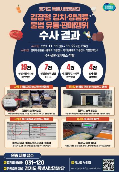 [뉴스서울] 경기도 특별사법경찰단은 김장철 김치·양념류 불법 유통·판매행위를 수사해 김치 제조·가공업소 등에서 영업자 준수사항 위반행위 및 영업장 불법 확장 등 총 34건을 적발했다고 10일 밝혔다.