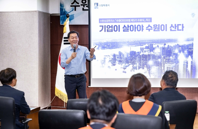 [뉴스서울] 이재준 수원시장은 25일 열린 ‘수원상공회의소 수원CEO포럼’ 제5기 수료식에서 특강을 하고, “기업하기 좋은 도시를 만들기 위해 더 힘차게 달려가겠다”고 말했다.