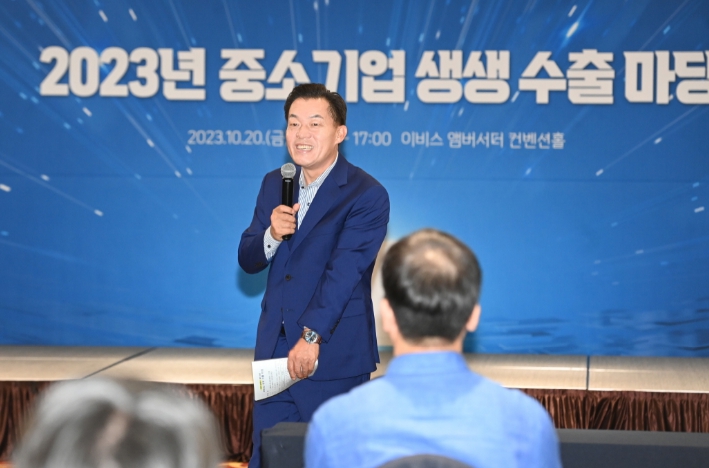 ▲ 이재준 수원시장이 지난해 10월 열린 ‘2023년 중소기업 생생 수출마당’에서 수원시의 중소기업 지원 시책을 설명하고 있다. |