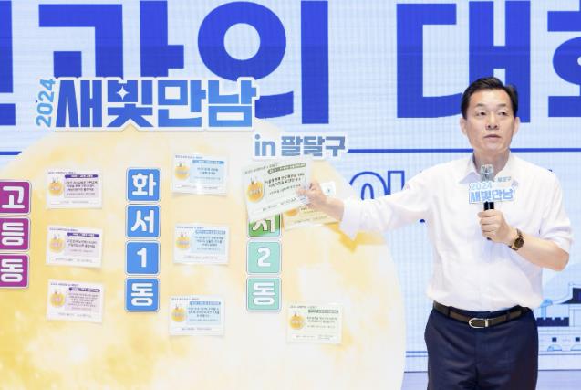 4일 정조테마공연장에서 열린 팔달구 권역 2024 새빛만남에서 시민들을 만난 이재준 시장은 “공간 대전환으로 도시공간을 효율화하고, 경제 대전환으로 지역경제를 활성화하고, 생활 대전환으로 주거환경을 안정화하겠다”며 “수원 대전환을 위한 규제를 개선하는 데 시민 여러분의 동참이 필요하다”고 말했다.