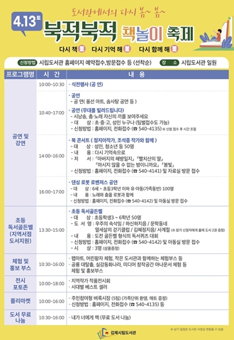 [뉴스서울] 김제시립도서관은 오는 13일 10시부터 ‘도서관에서의 다시 봄~봄~〔다시 책 봄, 기억해 봄, 함께 해 봄〕’을 주제로 제6회 북적북적 책 놀이 축제를 운영한다고 밝혔다.