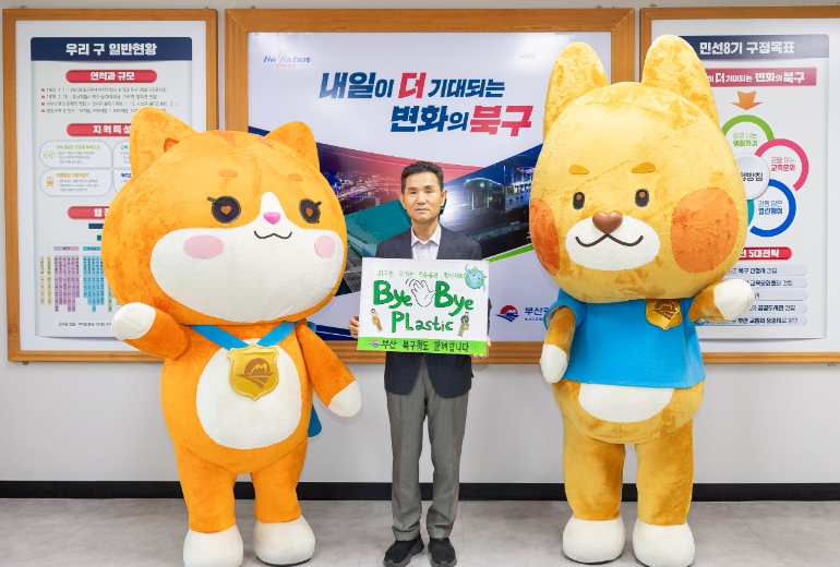 이번 챌린지 참여 인증은 바이바이 플라스틱의 의미를 되새기고자 버려진 종이박스를 재활용하여 제작한 홍보물과 북구의 소통 캐릭터 뿌꾸, 꾸미와 함께했다.