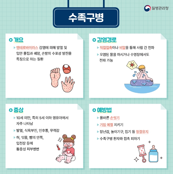 수족구병은 이달 말부터 증가하기 시작해 6월 중순 또는 7월까지 유행하는 급성바이러스성 질환으로 영유아에게 주로 발생한다. 또한 전염성이 강해 어린이집이나 유치원 등 집단생활에서 전파될 가능성이 클 뿐만 아니라 가정, 지역사회로 빠르게 확산한다.