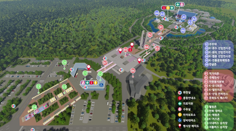 주제 전시관에서는 겨레의탑 미디어파사드를 비롯한 미디어폴 등 최첨단 기술을 결합한 작품을 선보이며 ‘푸드 전시관’에서는 농심, 빙그레, 림스치킨 등 16개 기업이 참여해 세계인의 입맛을 사로잡은 K-푸드의 변천사를 둘러보고 시식할 수 있는 시간을 마련한다.