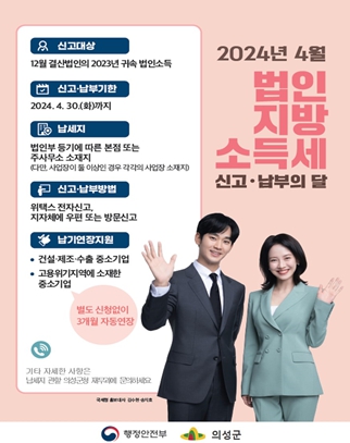 [뉴스서울] 의성군은 4월 법인지방소득세 신고납부의 달을 맞이해 관내에 사업장을 둔 법인을 대상으로 법인지방소득세 집중 신고․납부기간을 운영한다.