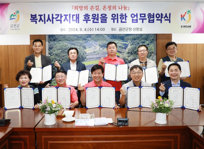 [뉴스서울] 금산군은 지난 4일 군청 상황실에서 관내 복지사각지대 해소를 위해 13개 후원업체와 업무협약을 체결했다.