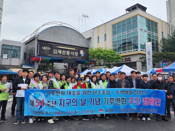 [뉴스서울] 김제시는 제54회 지구의 날(4월 22일)을 맞아 지난 22일 환경과·청소자원과 직원과 그린리더협의회·자연보호협의회 회원 60여명이 참여해 전통시장 일원에서 에너지절약 및 자원순환 실천 안내 캠페인을 실시했다고 밝혔다.