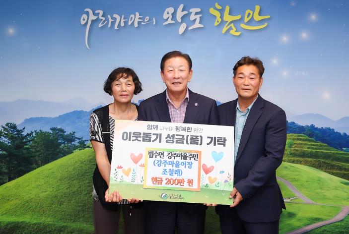 이에 조근제 함안군수는 “강주마을 주민들이 어려운 이웃을 위해 나눔을 실천해 주셔서 감사하다”며 “성금은 도움이 필요한 저소득계층에게 잘 전달하겠다”고 말했다.
