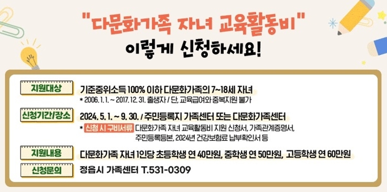 ▲ 정읍시, 다문화가족 교육활동비 지원...최대 60만원 |