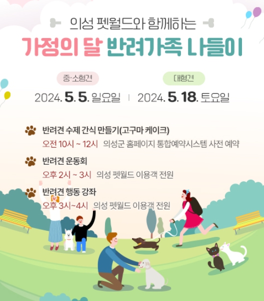 [뉴스서울] 의성군은 의성 펫월드에서 가정의 달을 맞이하여 5월 5일과 18일, 2회로 나눠 가족 구성원인 반려견과 함께 즐길 수 있는 체험형 프로그램 및 강좌를 진행한다고 밝혔다.