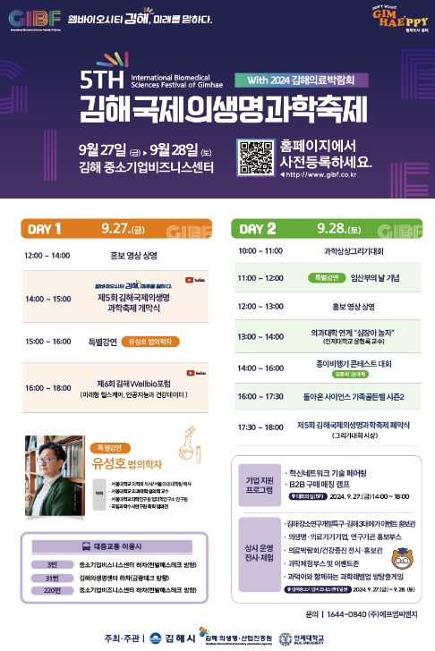 제5회 김해국제의생명과학축제는 ‘웰바이오시티 김해, 미래를 말하다’라는 주제로 중소기업비즈니스센터에서 개최되며 개막식과 제6회 김해웰바이오포럼은 시 공식 유튜브 채널 ‘가야왕도 김해TV’에서 중계된다.