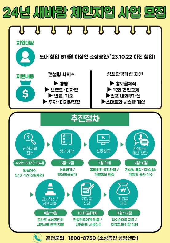 본 사업은 관내 창업 6개월 이상(사업자등록증 기준 2023년 10월 22일까지 창업한 자) 경영을 유지하고 있는 소상공인을 대상으로 전문 컨설팅, 점포 환경개선, 스마트화 시스템 개선, 홍보물 제작 등을 지원하며 지원 금액은 점포당 최대 1,400만원 이내, 총사업비의 70%를 지원한다.