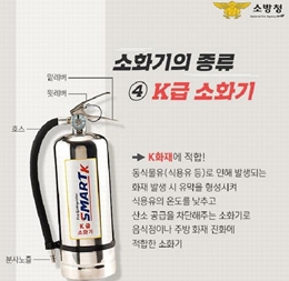 하지만 주방 전용 K급 소화기는 동식물유(식용유 등)로 인한 화재 발생 시 기름막을 형성시켜 식용유의 온도를 낮추고 산소 공급을 차단해 음식점이나 주방에서 사용하는 것이 적합하다.