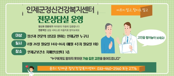 군은 주민의 정신건강 증진을 위해 이달부터 인제군보건소 정신건강복지센터에 전문상담실을 설치, 월 1회 전문의 상담을 운영한다고 밝혔다.