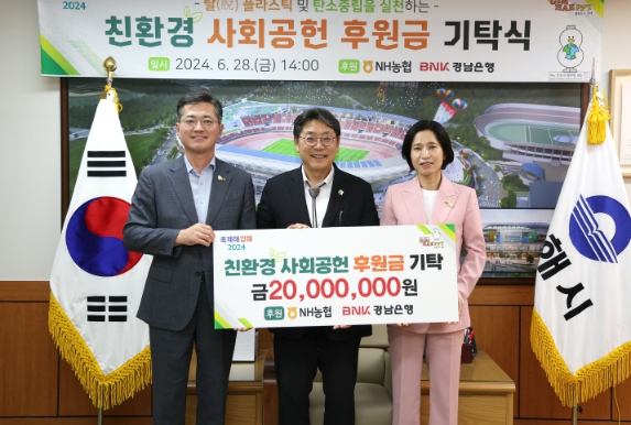 시는 NH농협은행과 BNK경남은행이 친환경사회공헌 기부에 3년 연속 동참하도록 이끌고, 28일 두 은행과 1회용품 폐기물 발생저감 및 탈(脫) 플라스틱 사회로의 전환을 위한 탄소중립 시책 추진에 동참하는 의미로 2천만원을 기탁했다.