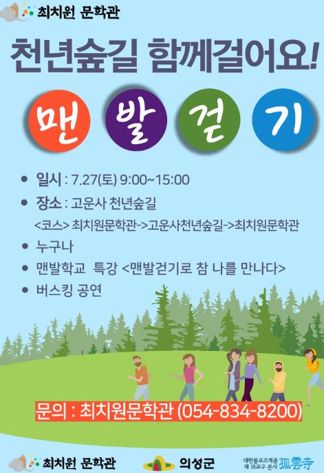올해로 4회째를 맞는 천년숲길 맨발걷기 행사는 최치원문학관이 주최·주관하고 의성군과 고운사에서 후원하는 행사로 최치원문학관에서 고운사 일주문까지 1.5km구간을 맨발로 걷는 행사이다.