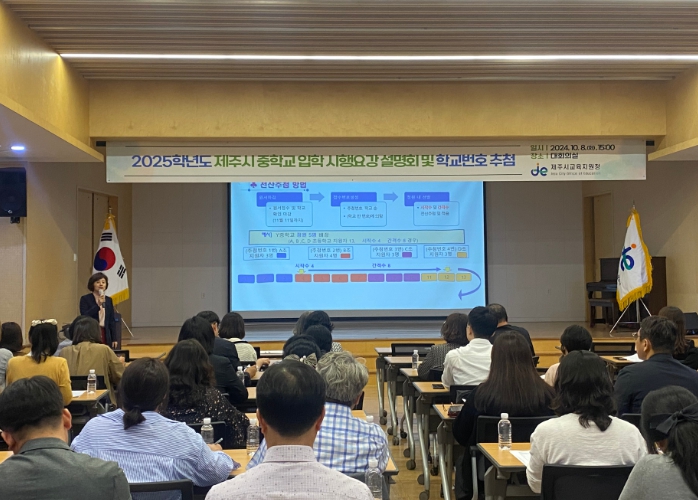 [뉴스서울] 제주시교육지원청은 8일 제주시 학교군(동지역) 초등학교 교감 선생님 및 학부모 대표를 대상으로‘2025학년도 제주시중학교 입학 시행 요강 설명회 및 학교 번호 추첨’을 실시했다.
