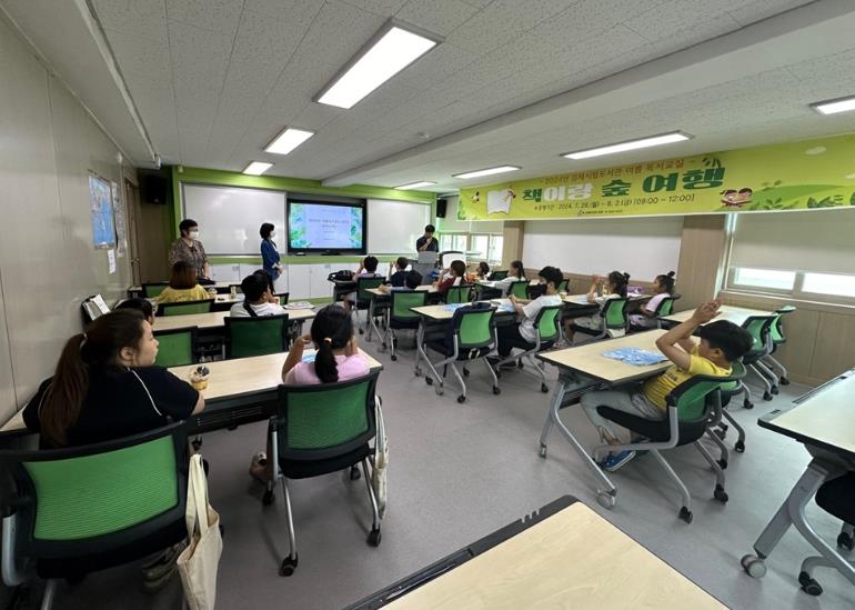이번 여름 독서교실은 ‘책이랑 숲 여행’을 주제로 ‘브레인 스토밍 활동지’, ‘자벌레 만들기’, ‘단어 스피드 게임’, ‘북 토크’, ‘곤충 역할극’ 등 다양한 프로그램이 진행됐으며 5일간 25명의 학생들이 시립도서관 리모델링 공사 관계로 평생학습관에서 운영됐다.