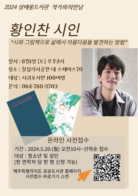 이날 열리는 작가와의 만남은 “시와 그림책으로 삶에서 아름다움을 발견하는 법”을 주제로 황인찬 시인이 들려주는 시의 아름다움에 대해 함께 모인 참가자들과 이야기 나눠볼 예정이며 북토크 사전신청은 20일 오전 10시부터 제주특별자치도 공공도서관 홈페이지를 통해 선착순으로 이뤄질 예정이다.