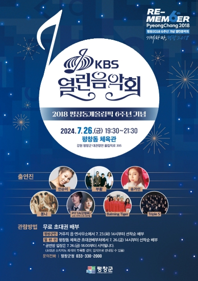 심재국 평창군수는 “2018 평창 동계올림픽 6주년 기념 'KBS 열린음악회'에 평창군민과 인근 지역 주민분들을 초청하고자 한다.”라며, “음악회와 함께 2018 올림픽의 감동도 다시 한번 되새길 수 있는 자리가 되길 바란다.”라며 초청 인사를 전했다.