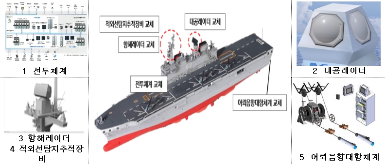 두 번째, 기존 네덜란드에서 수입한 회전형 대공 레이다가 국내에서 개발한 4면 고정형 AESA 레이다로 교체된다. 이 레이다는 울산급 Batch-III 호위함의 AESA 레이다를 독도함의 마스트(함정 갑판 위 수직으로 세운 기둥)에 맞게 하드웨어와 소프트웨어를 일부 변경·개발한 것으로 탐지거리 및 표적처리 개수가 2배 향상될 것으로 예상된다.