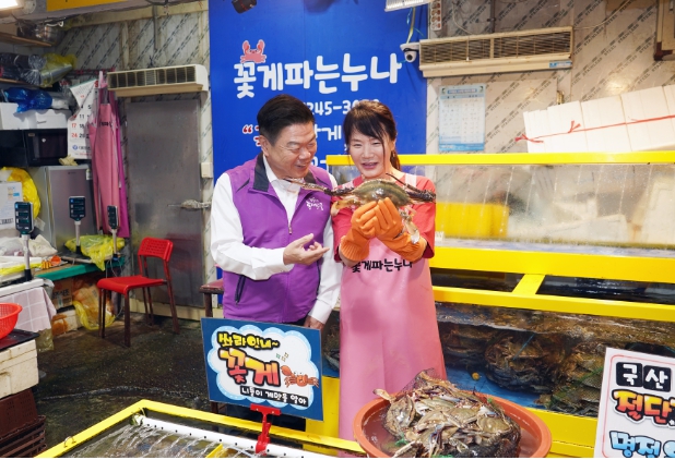 ▲ 동대문구 꽃게 판매점을 방문한 이필형 동대문구청장(사진 왼쪽) |