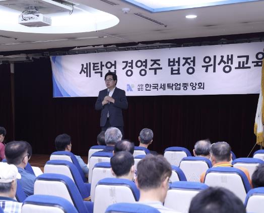 ▲ 박일하 동작구청장이 지난달 9일 서울 동작구 상도동 동작문화복지센터에서 열린 ‘한국세탁업중앙회 동작구지부 세탁업 경영주 위생교육’에 참석해 인사말을 하고 있다 |