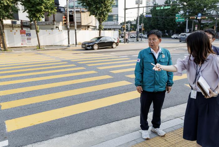 ▲ 지난 6월, 박강수 마포구청장이 현장구청장실을 통해 신석초등학교 앞 교통상황을 살피고 있다. |